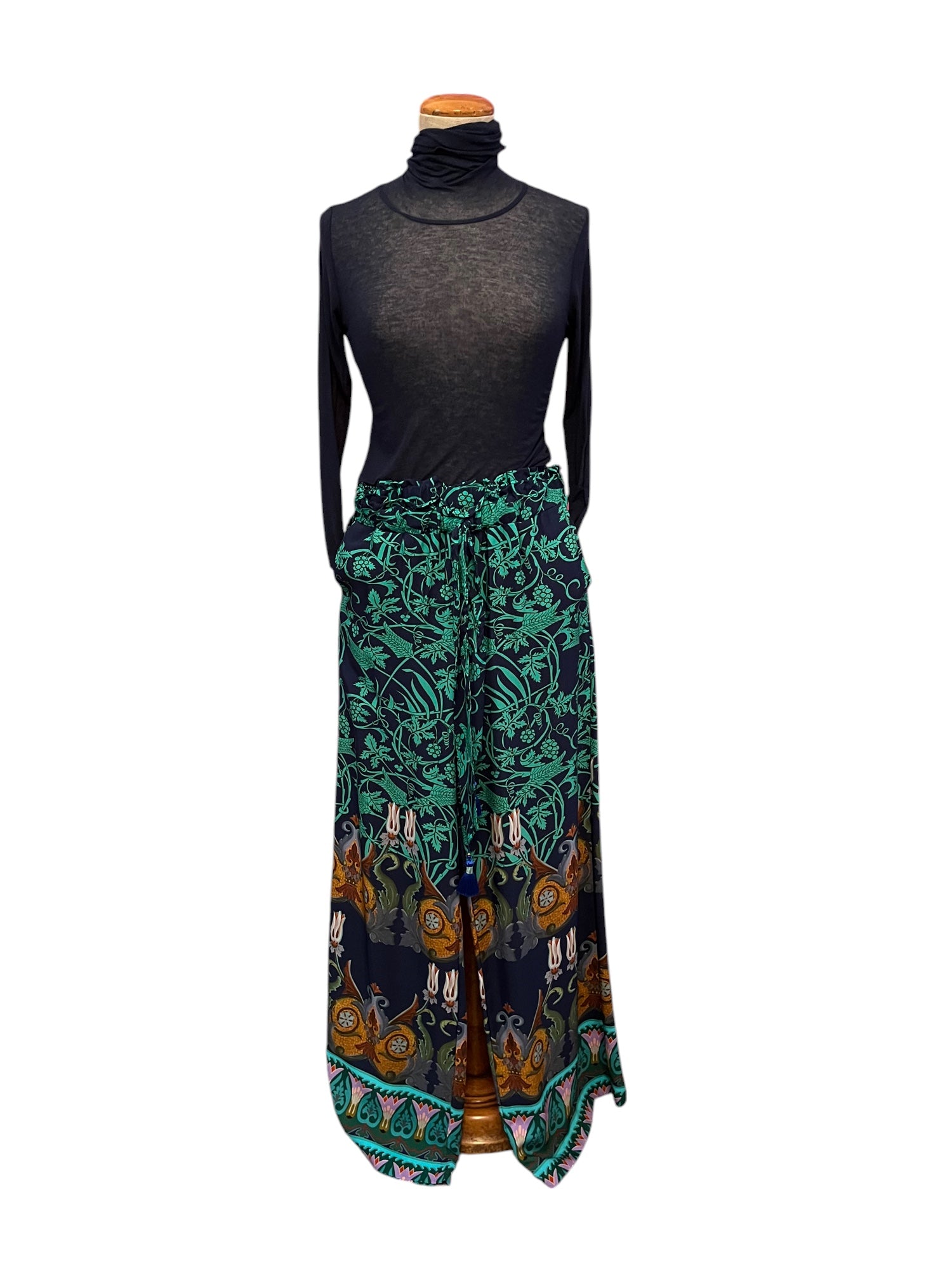 Wool jacket, printed viscose pants, Multitudes fabric bag, fine 100% cashmere top